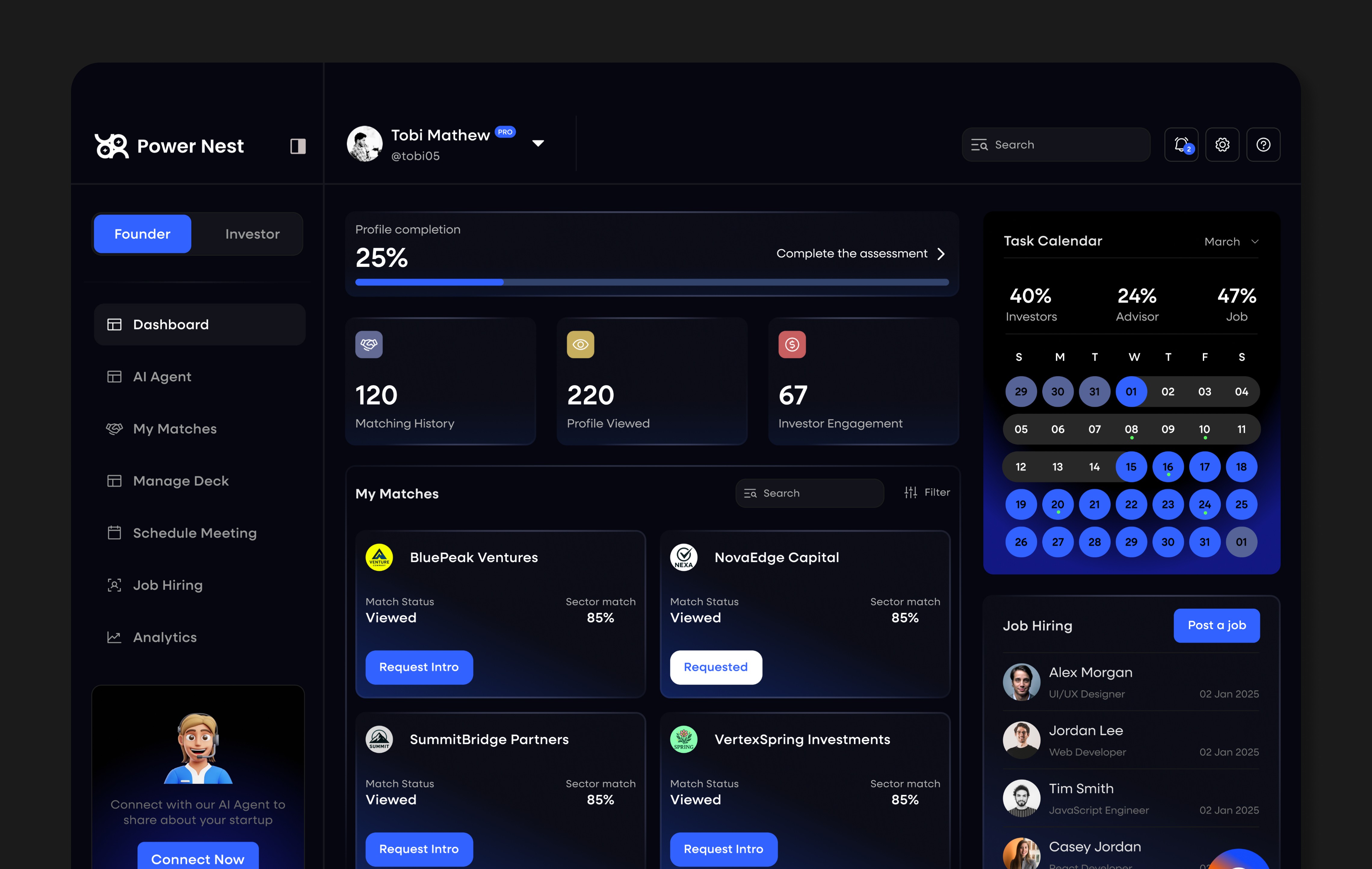 PowerNest was designed to simplify private investment discovery by combining AI-driven intelligence with end-to-end founder and investor support. It provides tailored dashboards, automated due diligence, and smart matchmaking tools that remove friction and deliver only high-quality, investor-ready opportunities.